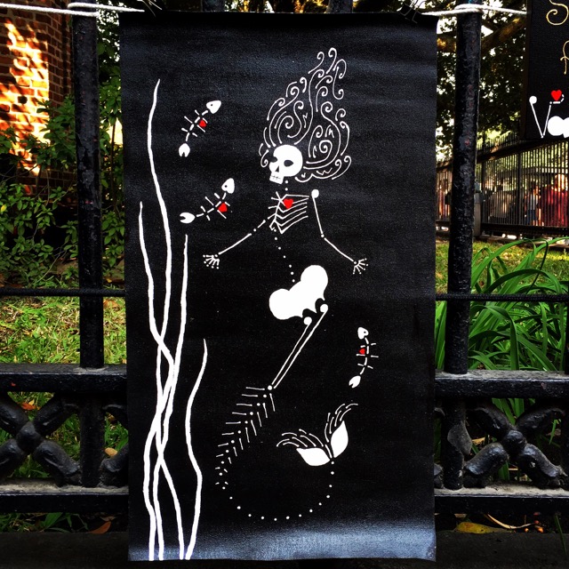 One of the first larger designs I made when beginning my Beautiful Bodies series was a mermaid. Over the years Ive painted this design over and over and eventually worked out three different mermaid poses I liked working with. I've even done a few versions of a larger banner painting with all three floating together surrounded by little fishy friends.