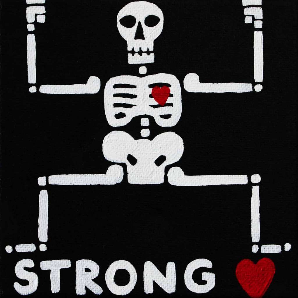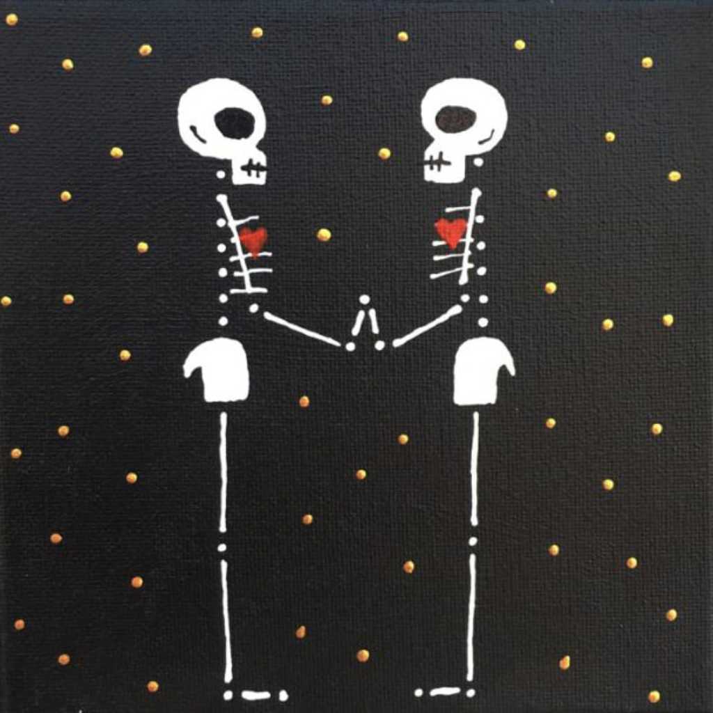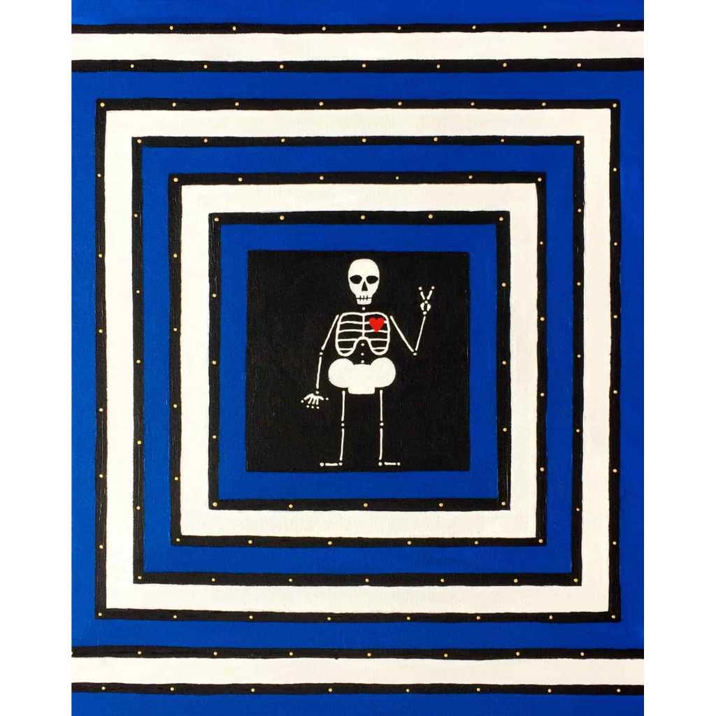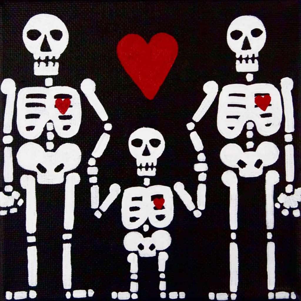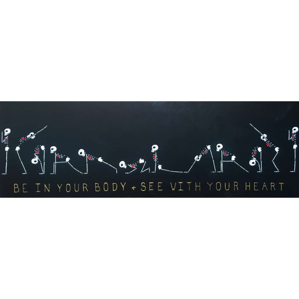Beautiful Bodies are acrylic canvas paintings of skeletons with hearts offering the meditation of “Be In Your Body and See with Your Heart”.