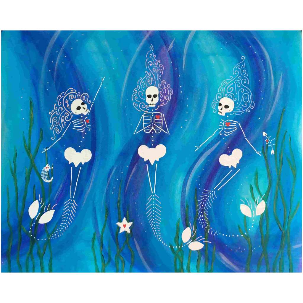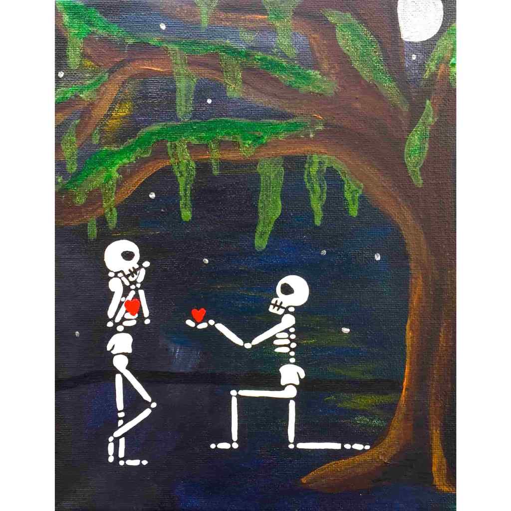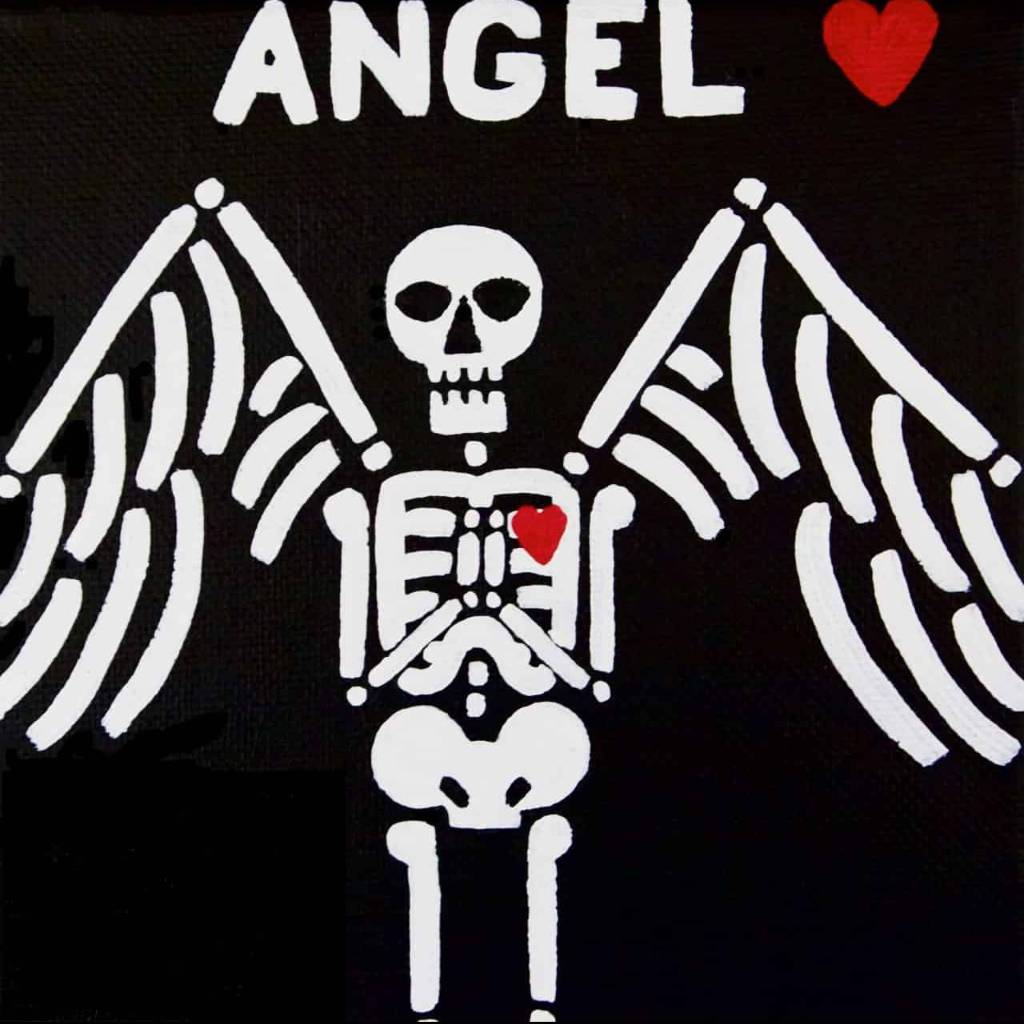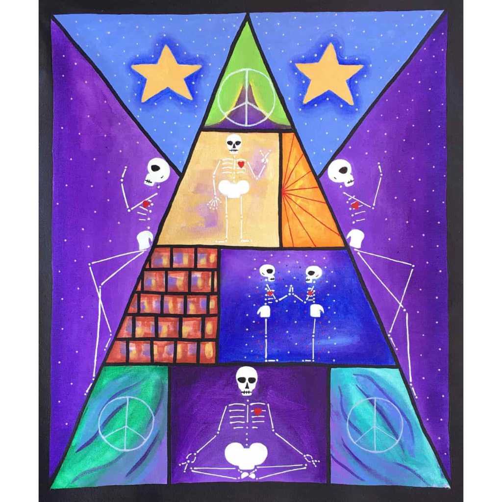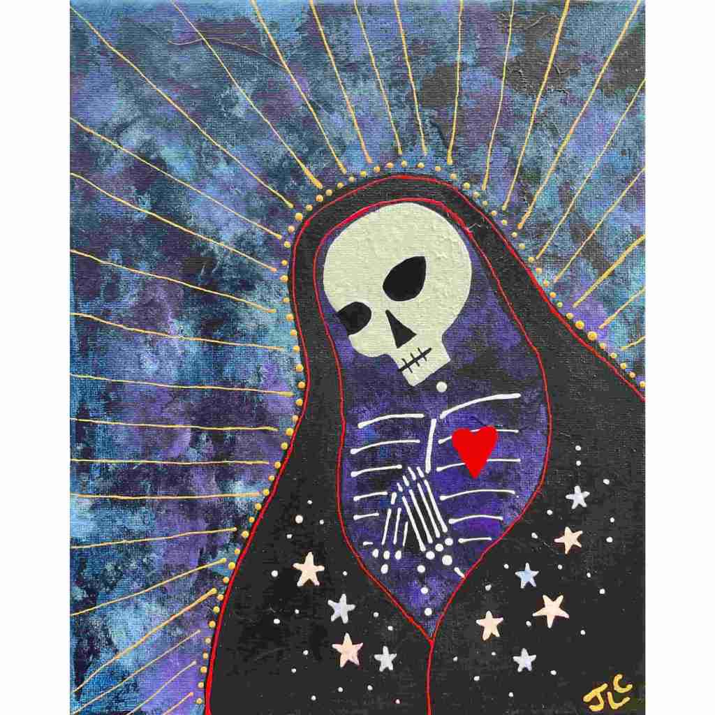 Beautiful Bodies are acrylic canvas paintings of skeletons with hearts offering the meditation of “Be In Your Body and See with Your Heart”.