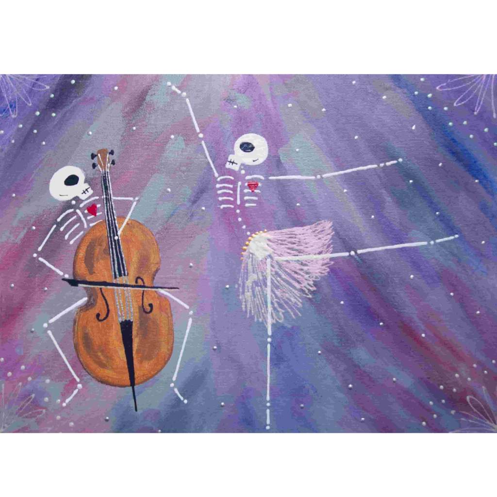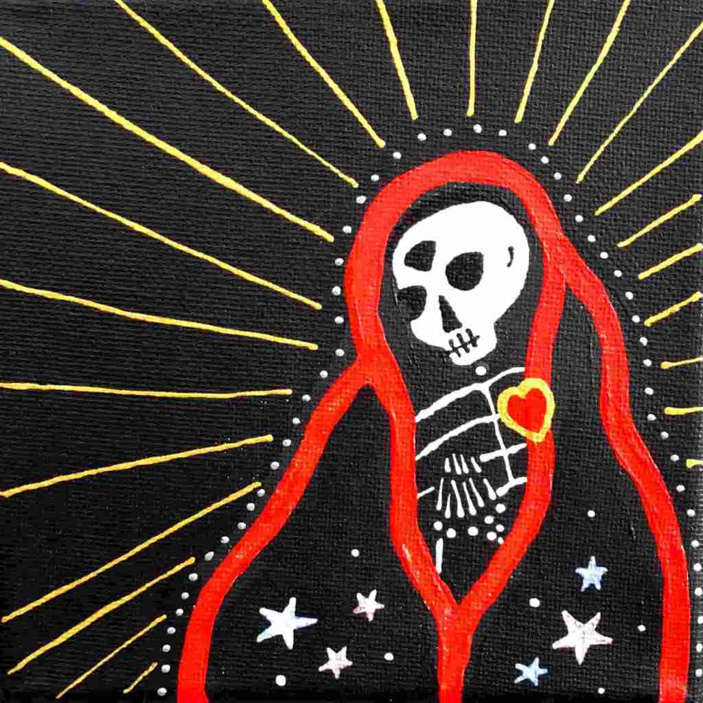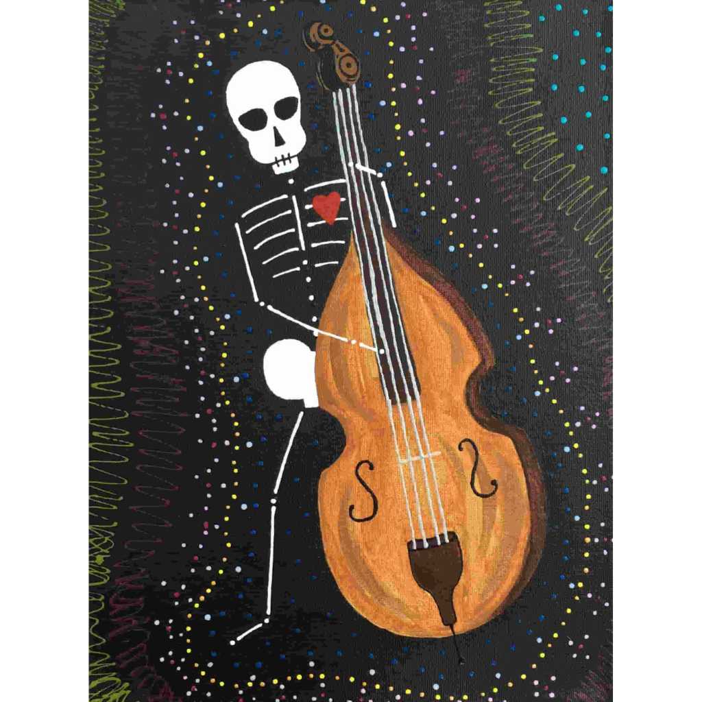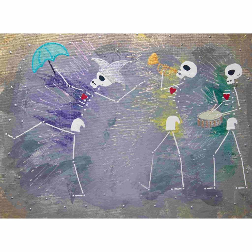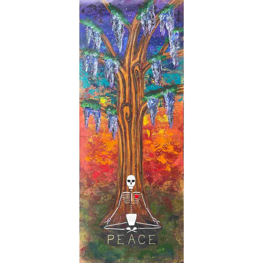 Beautiful Bodies are acrylic canvas paintings of skeletons with hearts offering the meditation of “Be In Your Body and See with Your Heart”.