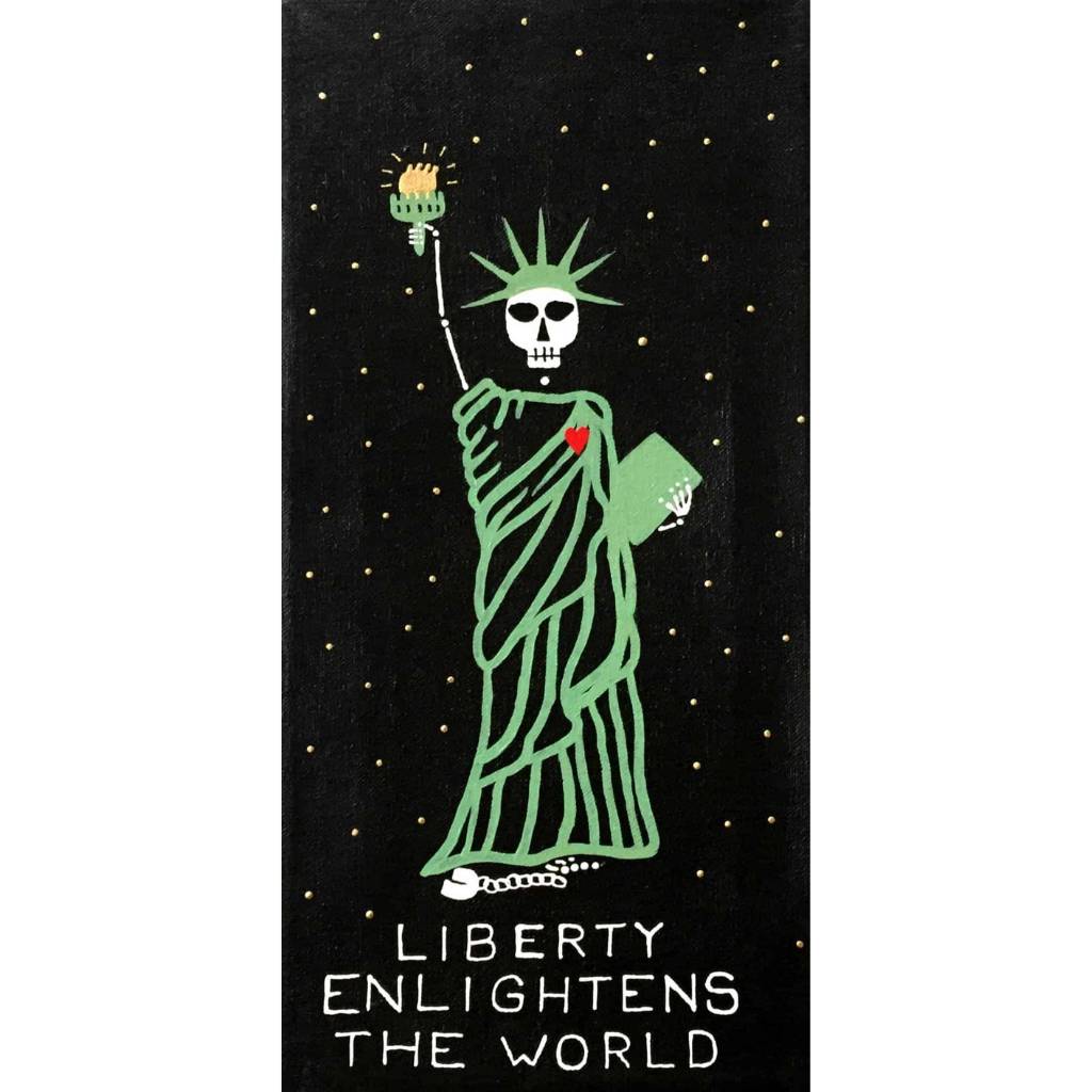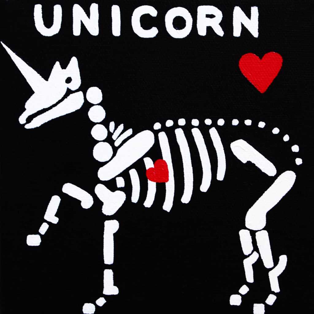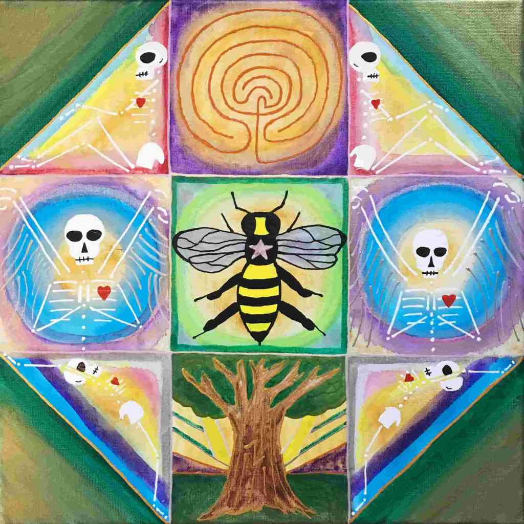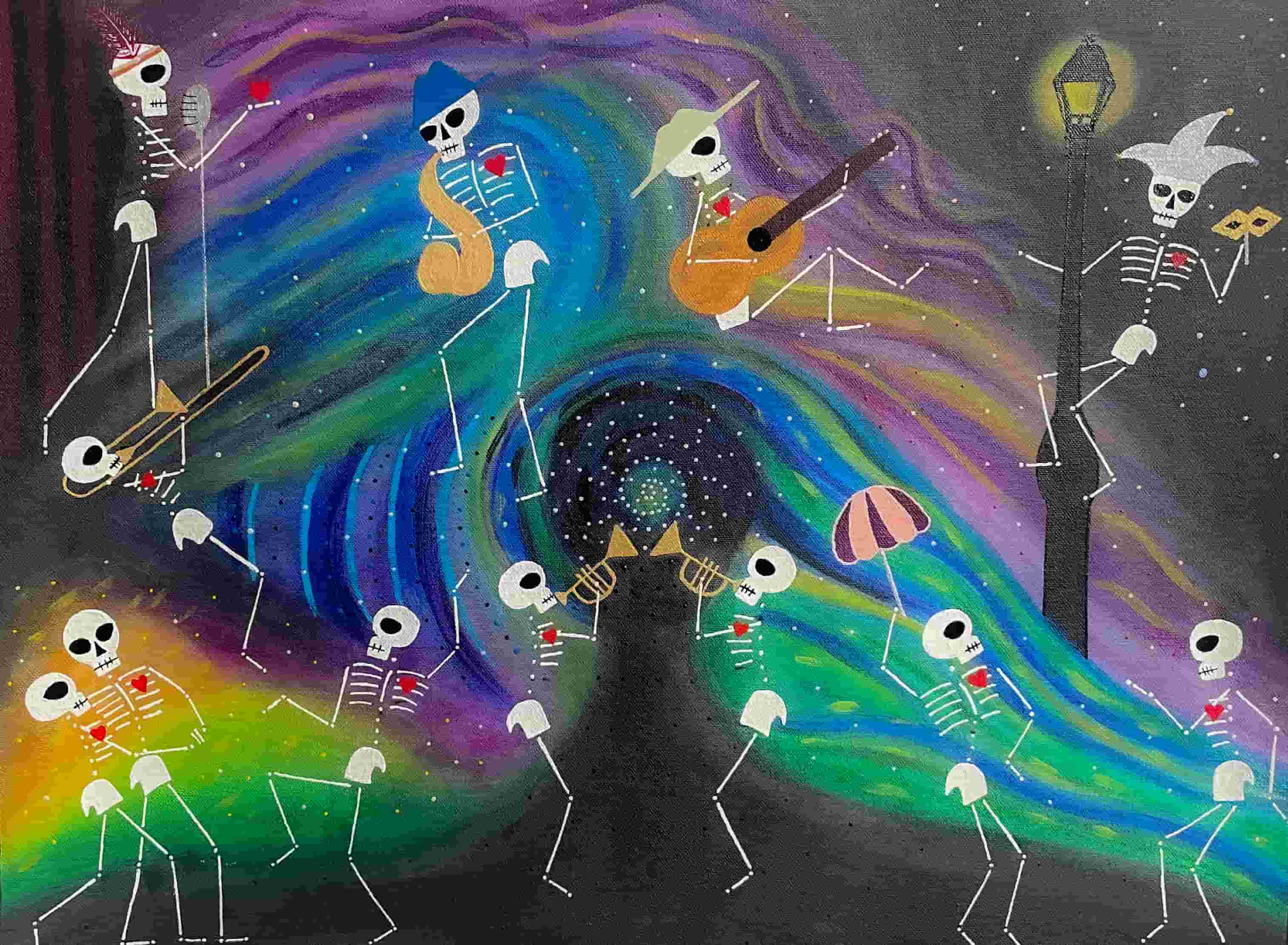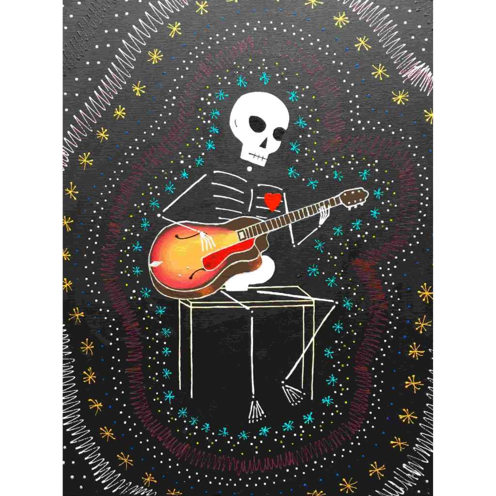 Beautiful Bodies are acrylic canvas paintings of skeletons with hearts offering the meditation of “Be In Your Body and See with Your Heart”.