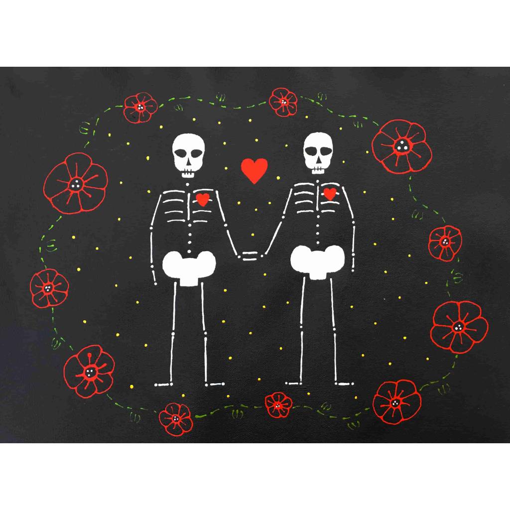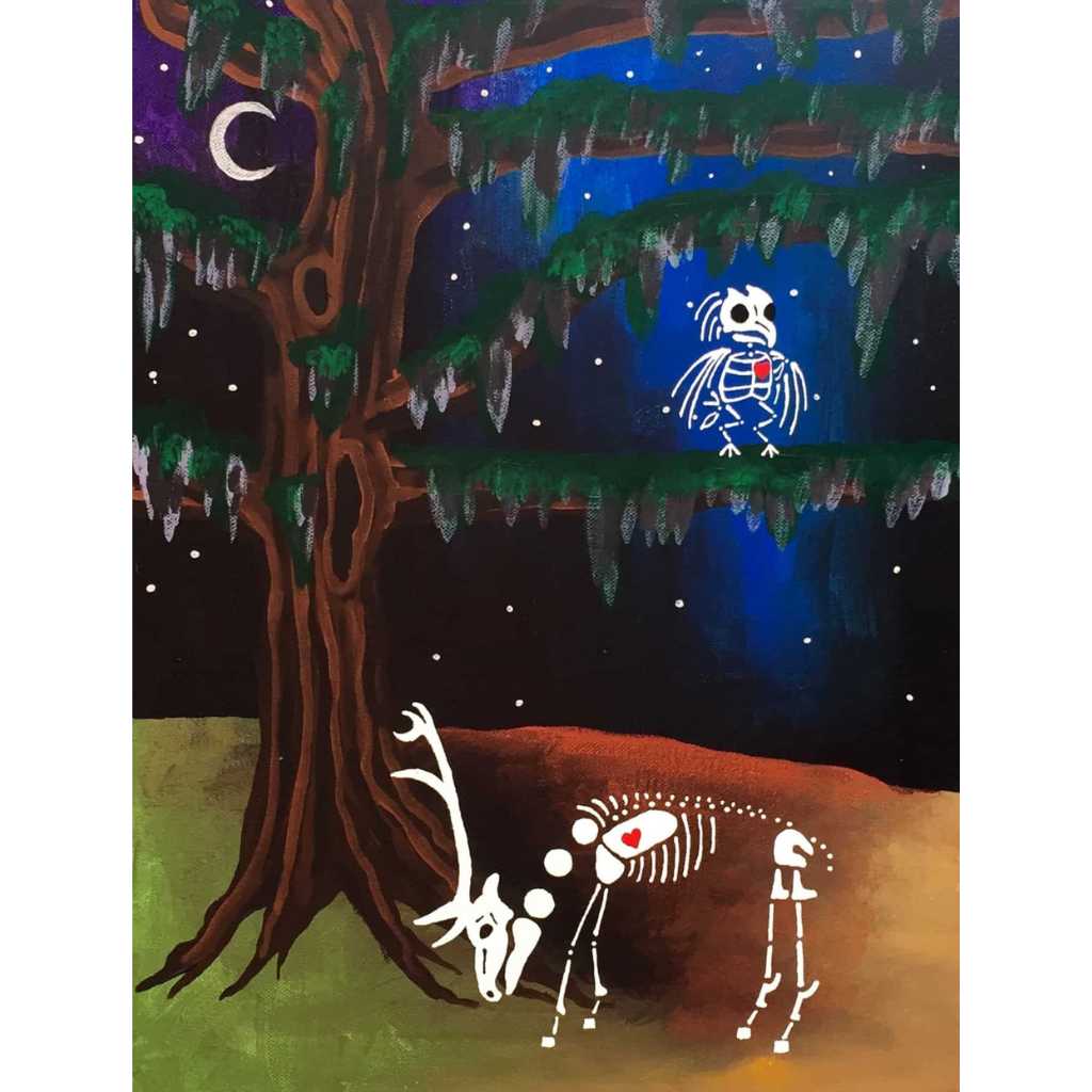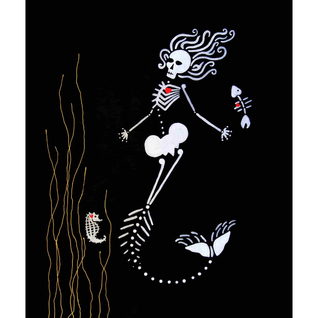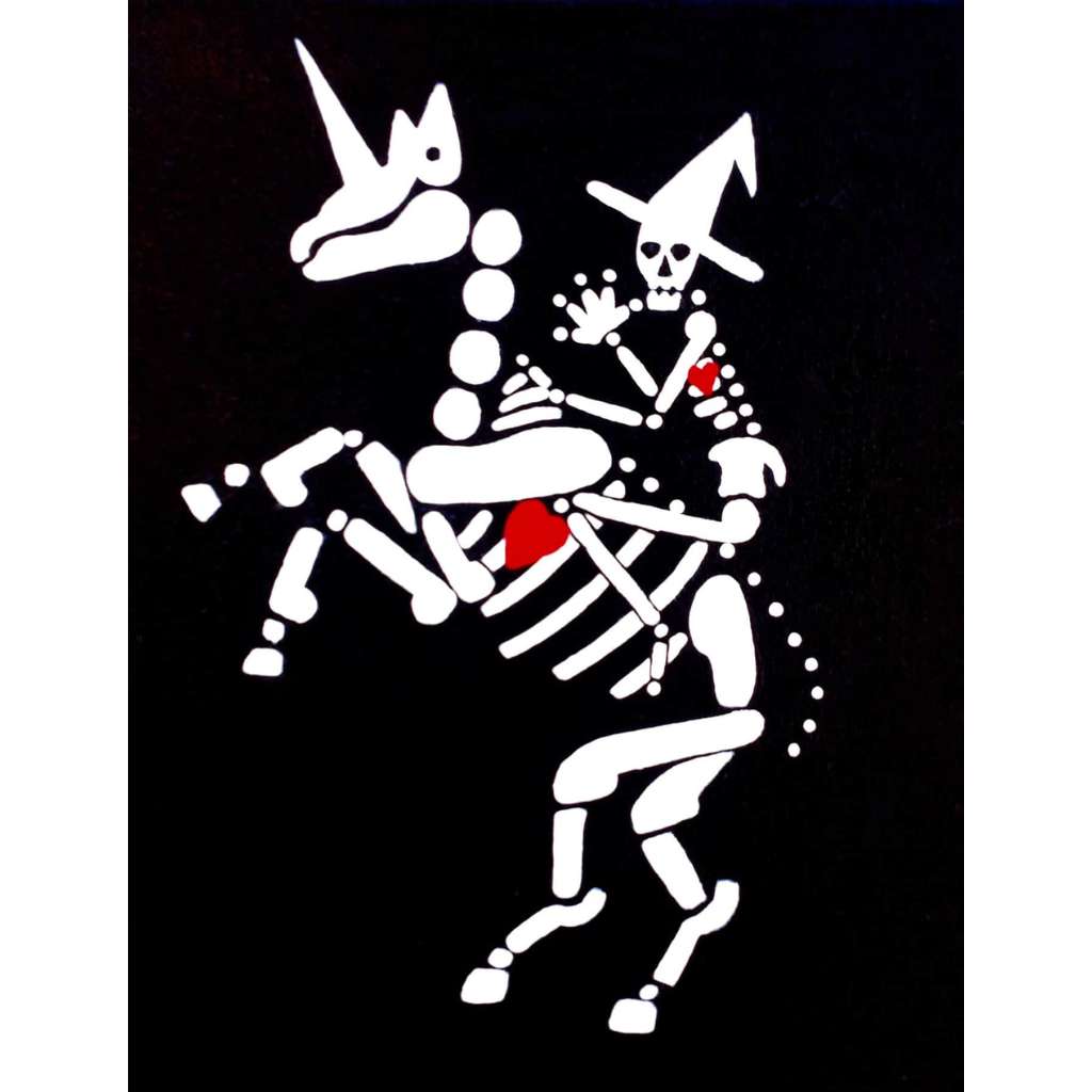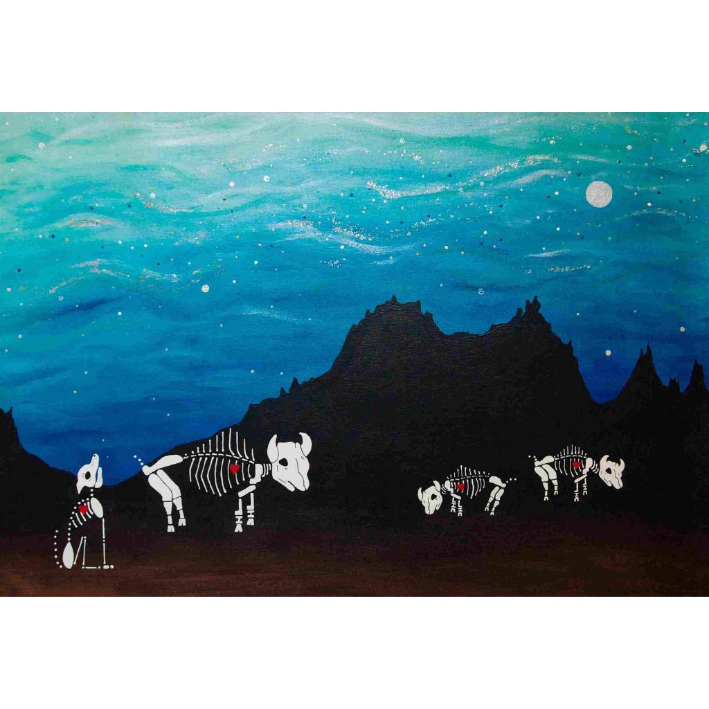 In this series skeletons symbolize our essential connection to nature and our ancestors and the heart is a reminder of our capacity for nurturing relationships. In my color palate black references grounded wisdom, white symbolizes interconnection, and red radiates passion.