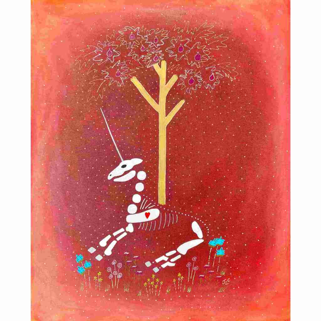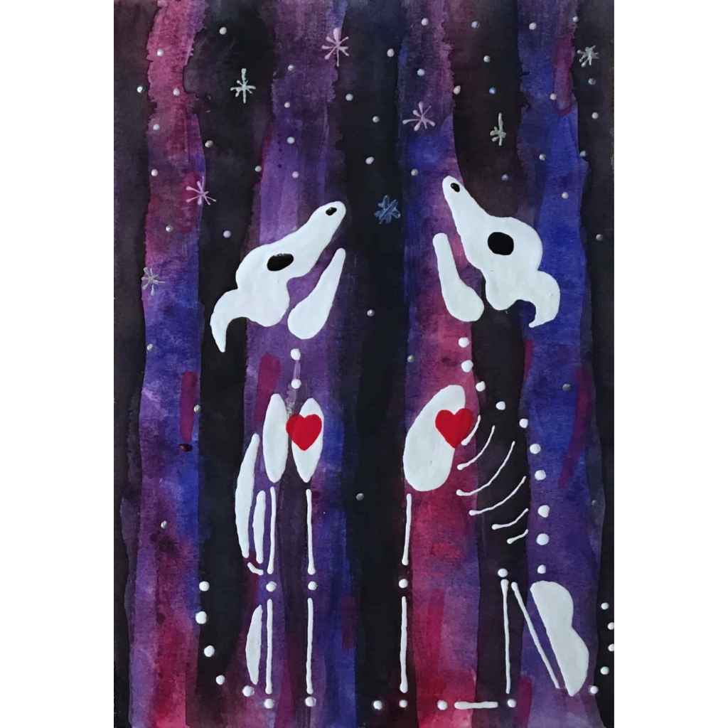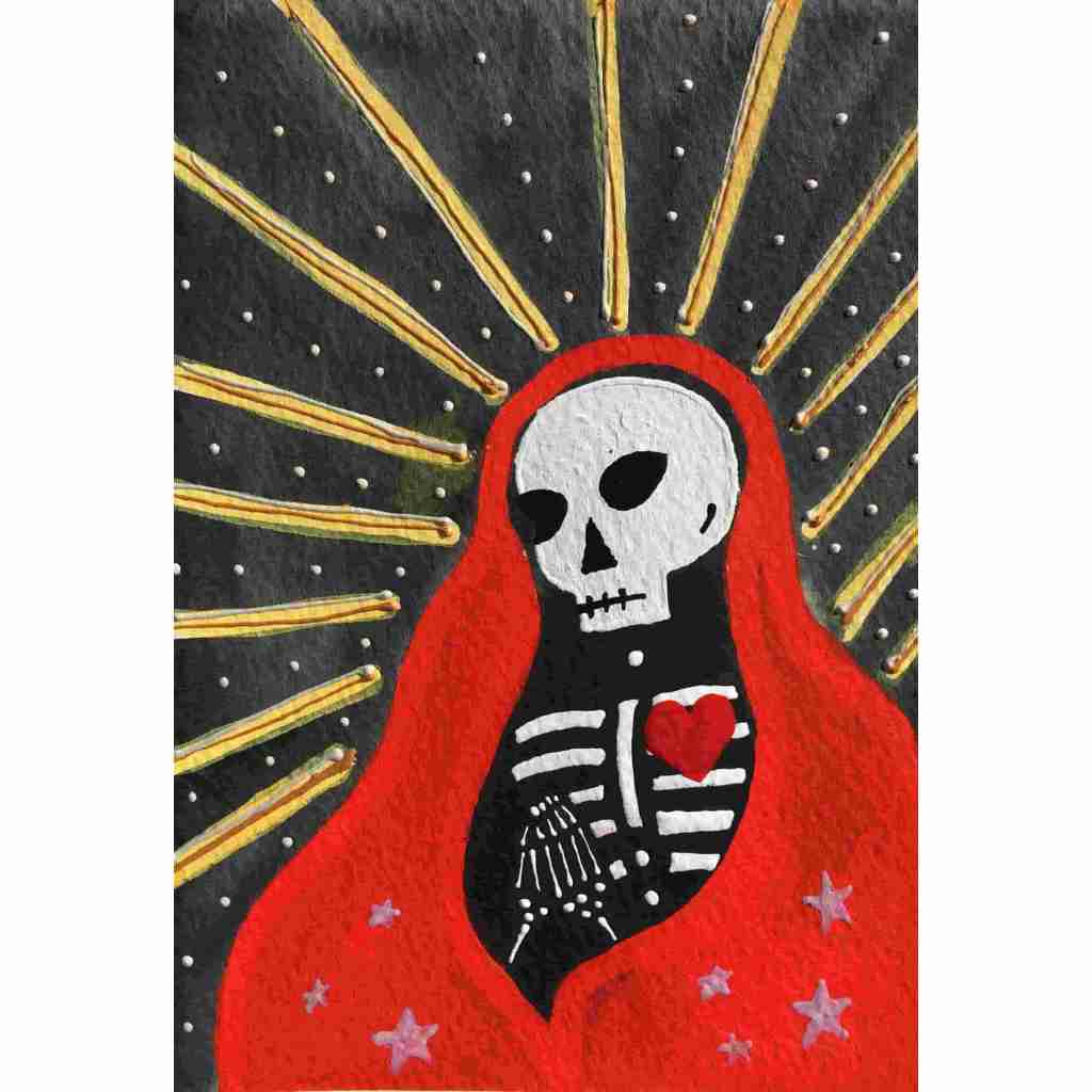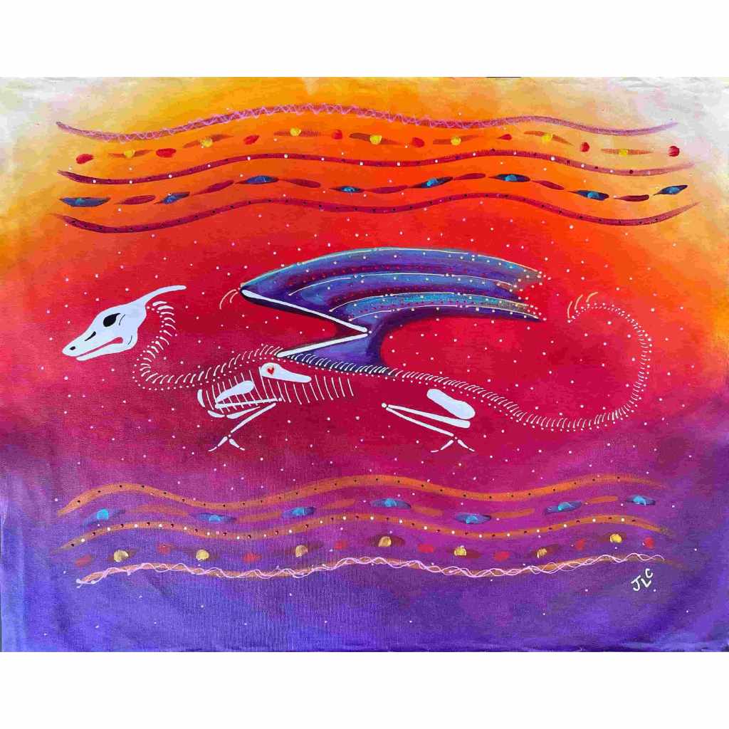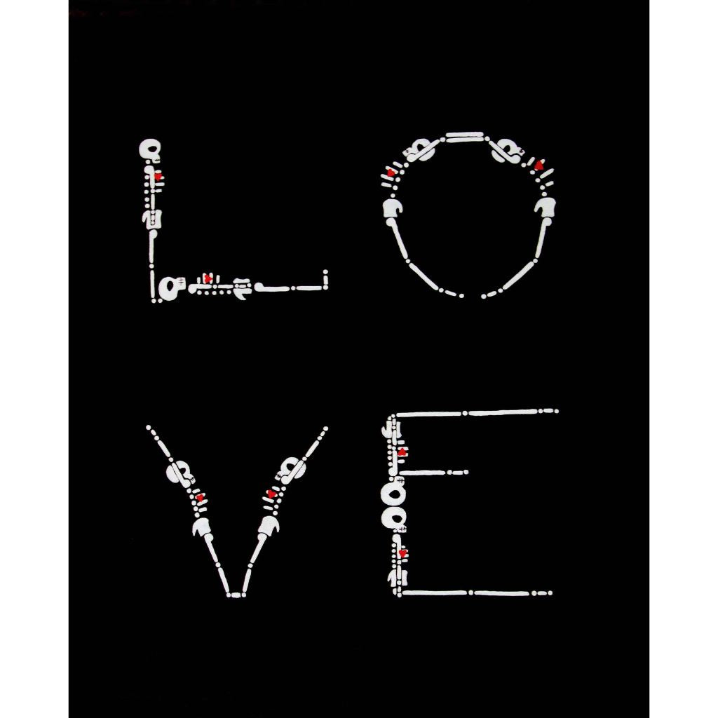 In this series skeletons symbolize our essential connection to nature and our ancestors and the heart is a reminder of our capacity for nurturing relationships. In my color palate black references grounded wisdom, white symbolizes interconnection, and red radiates passion.