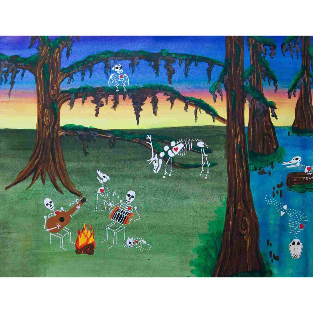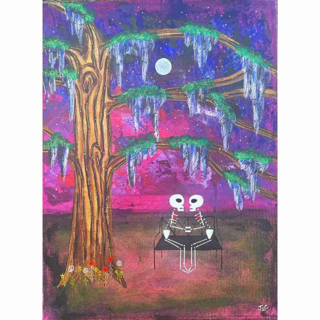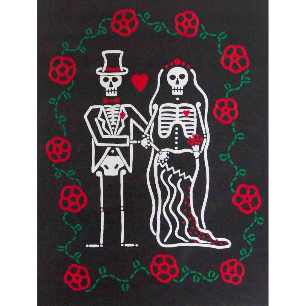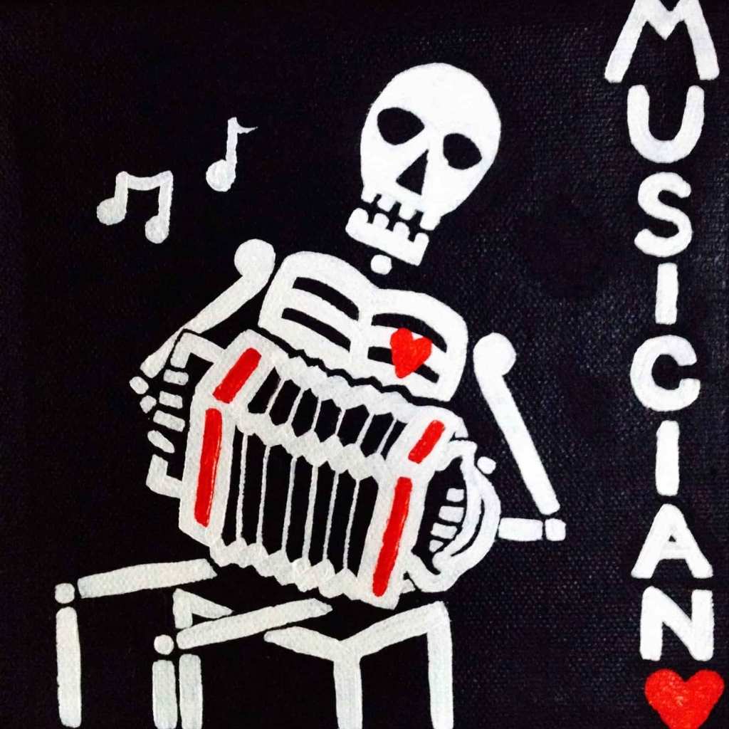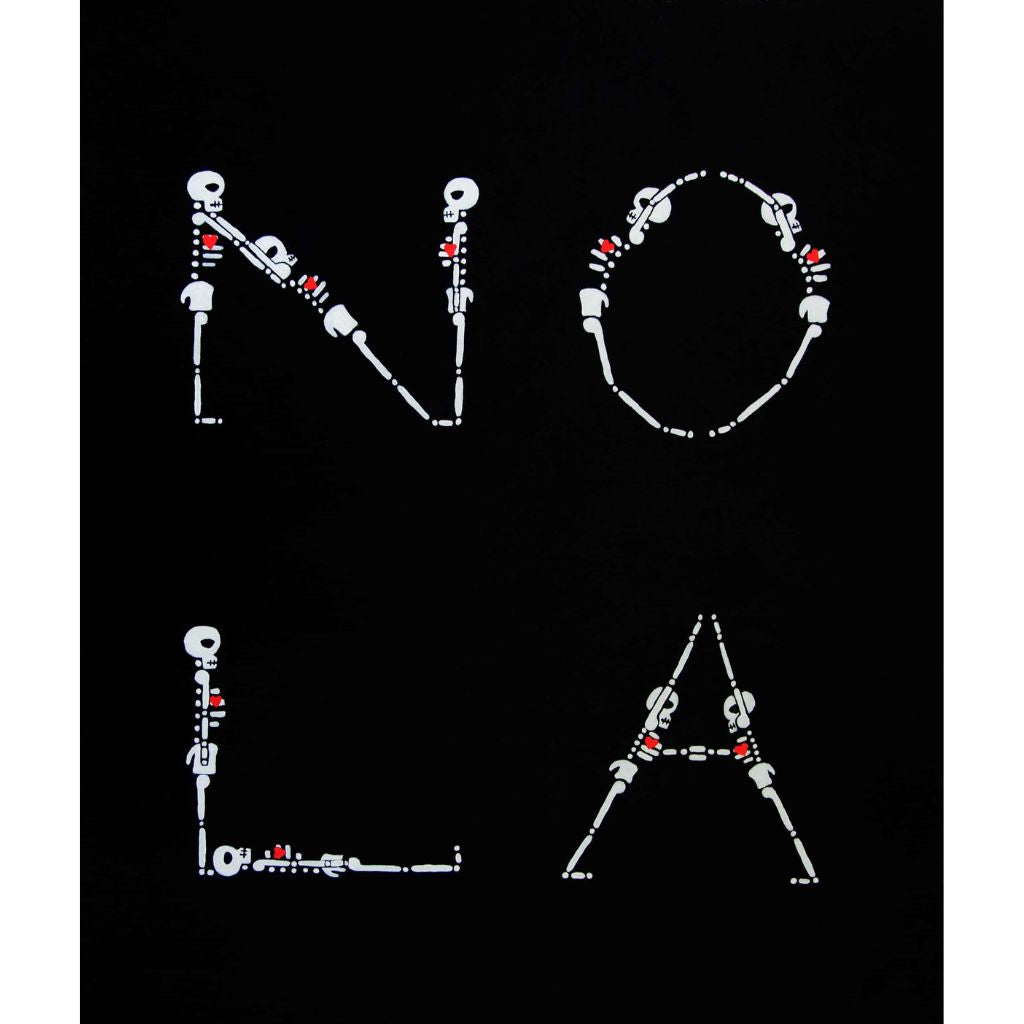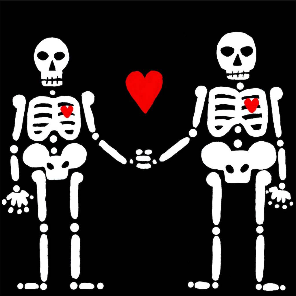 In this series skeletons symbolize our essential connection to nature and our ancestors and the heart is a reminder of our capacity for nurturing relationships. In my color palate black references grounded wisdom, white symbolizes interconnection, and red radiates passion.