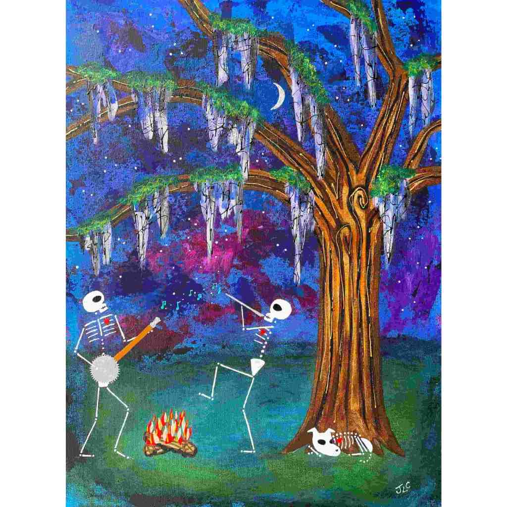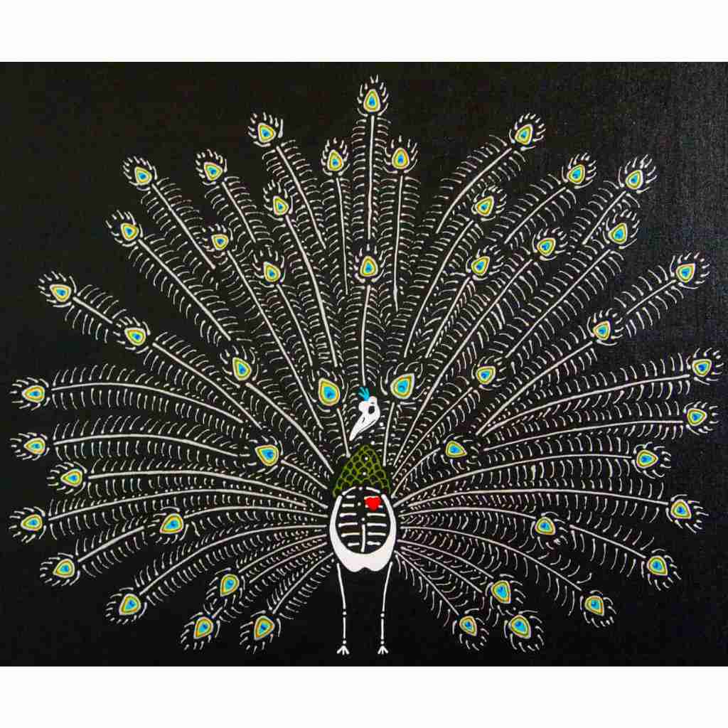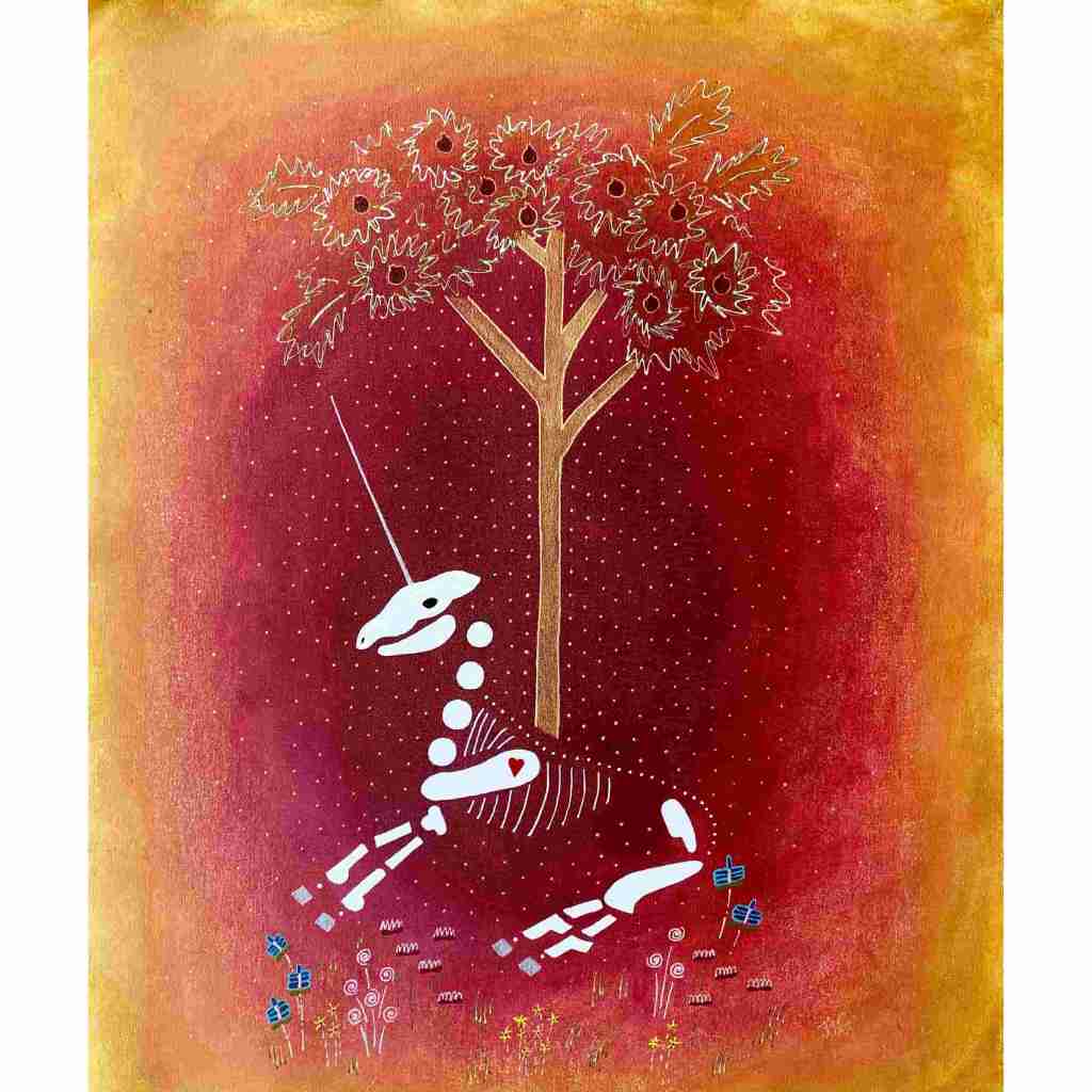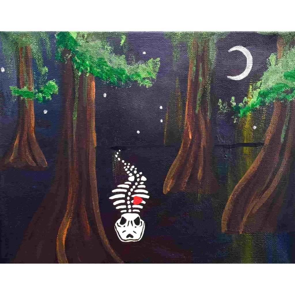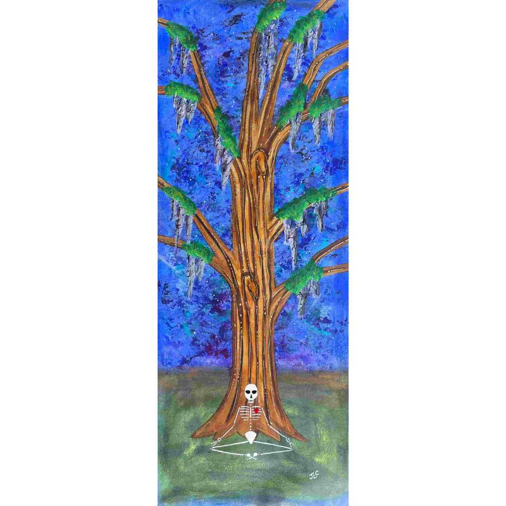 In this series skeletons symbolize our essential connection to nature and our ancestors and the heart is a reminder of our capacity for nurturing relationships. In my color palate black references grounded wisdom, white symbolizes interconnection, and red radiates passion.